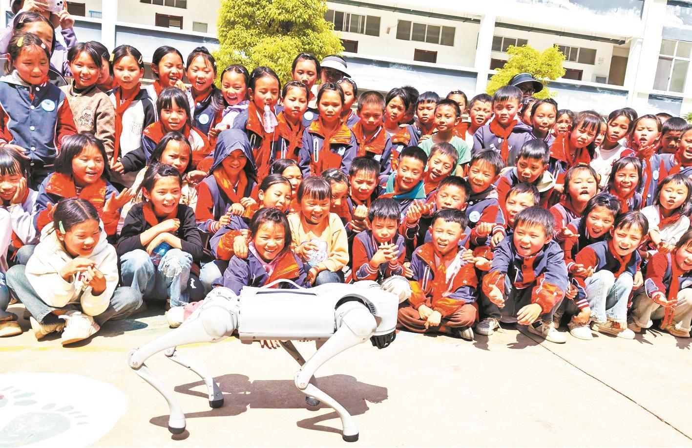 图为砚山县鲁都克小学师生在观看机器狗表演。